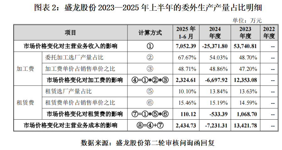 然而,第一轮审核问询函还显示,剥离上述子公司后,盛龙股份又因自身产能不足,向含上述剥离子公司在内的企业采购委外加工服务,使得该公司2023—2025年上半年来自委外生产的钼精矿产量占比超60%。