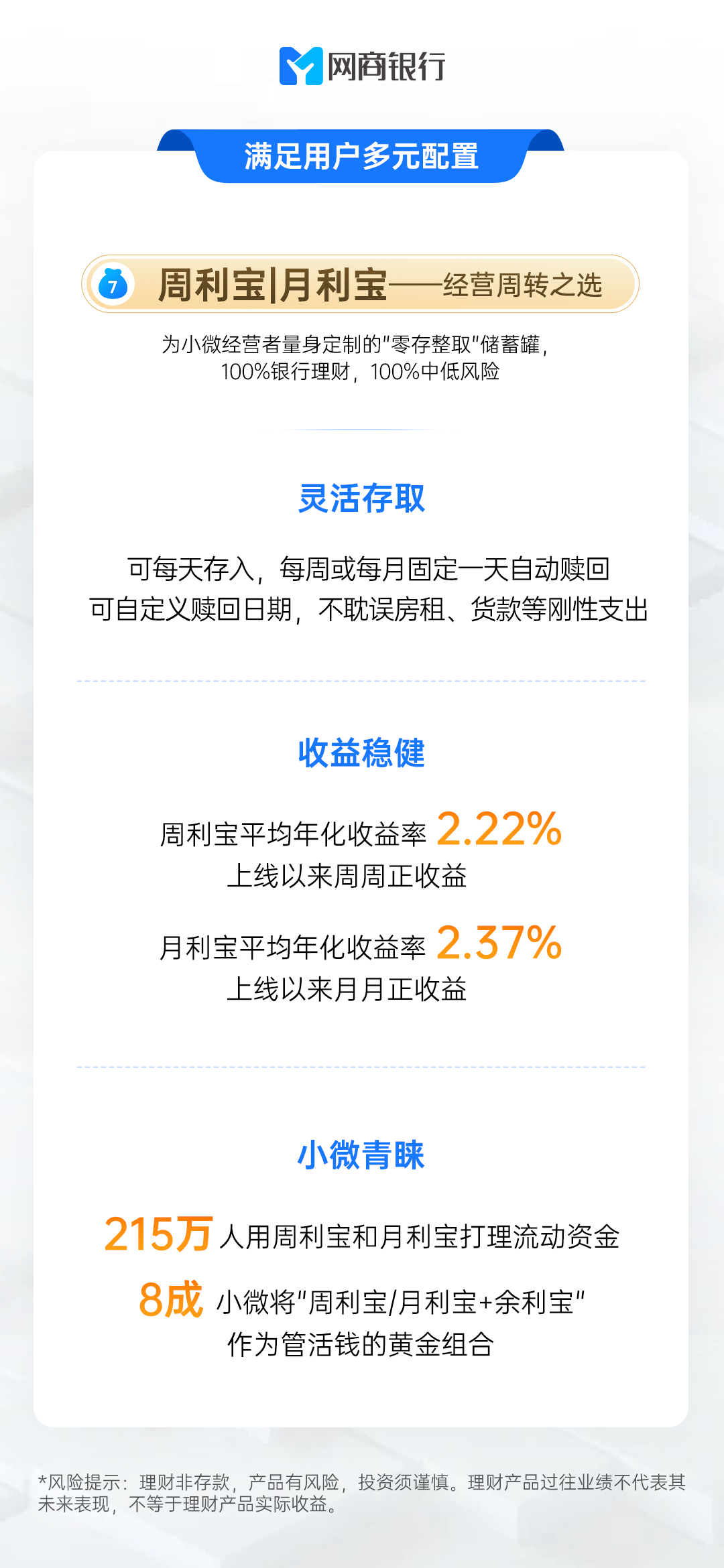 作为银行理财代销平台,网商银行通过严格选品与专业运作,让数千万小微客群也能享受到安全稳健的资产配置服务。