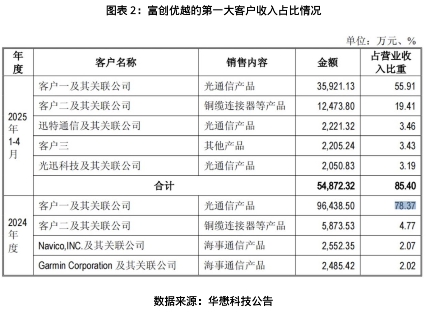 客户集中度高企是富创优越的另一大核心风险。公告显示,2024年富创优越的第一大客户收入占比高达78.37%,即便在2025年1—4月,该比例仍维持在55.91%。大客户的订单量波动、合作条款变更,甚至合作关系终止,都将对富创优越的经营业绩产生重大冲击。