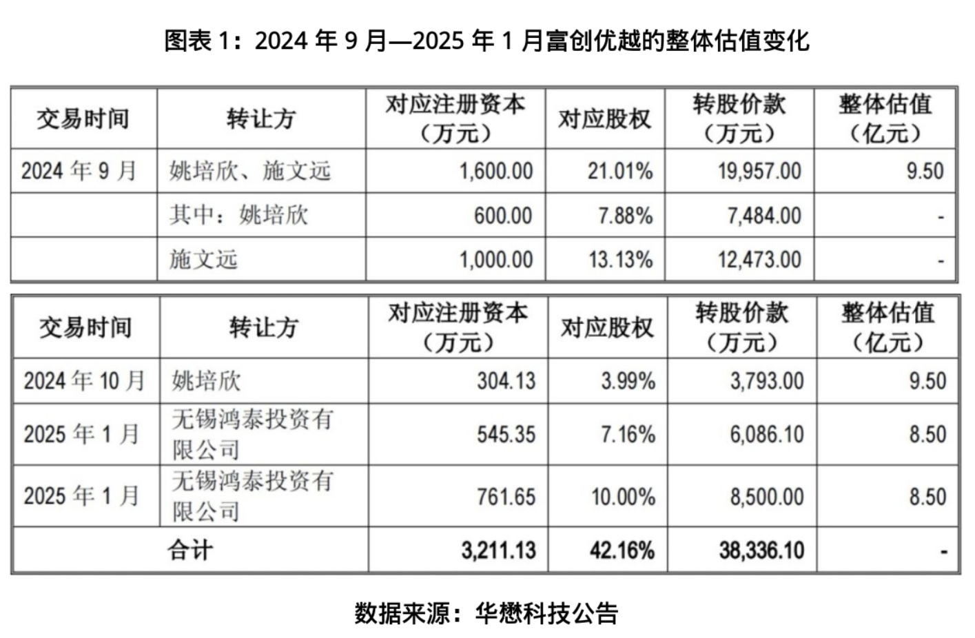 华懋科技对富创优越的跨界并购,也引发监管高度关注。公告显示,截至2025年1月,华懋科技已持有富创优越42.16%的股份,彼时富创优越整体估值为8.5亿元,较2024年10月的9.5亿元估值略有下降。然而,时隔仅3个月,本次并购的富创优越整体估值便跳升至26亿元,增长2倍多。
