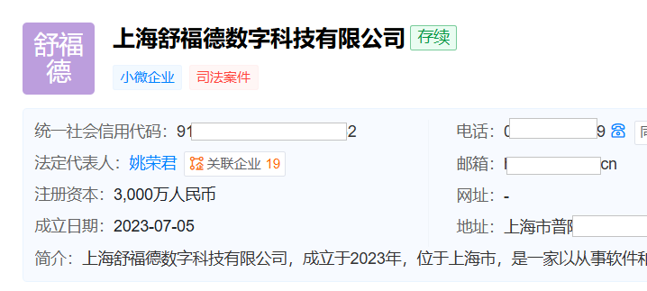 天眼查显示,上海舒福德成立于2023年7月,位于上海市普陀区,注册资本3000万元,主要从事软件和信息技术服务业。