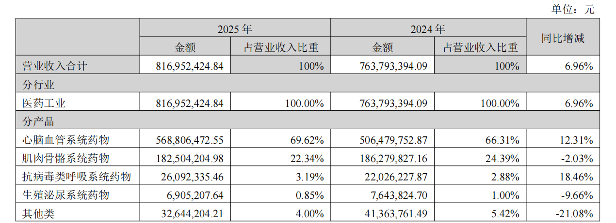 根据沃华医药2025年报数据,报告期内,公司收入主要集中在心脑血管系统及肌肉骨骼系统两大品类,合计营收占比超过九成。
