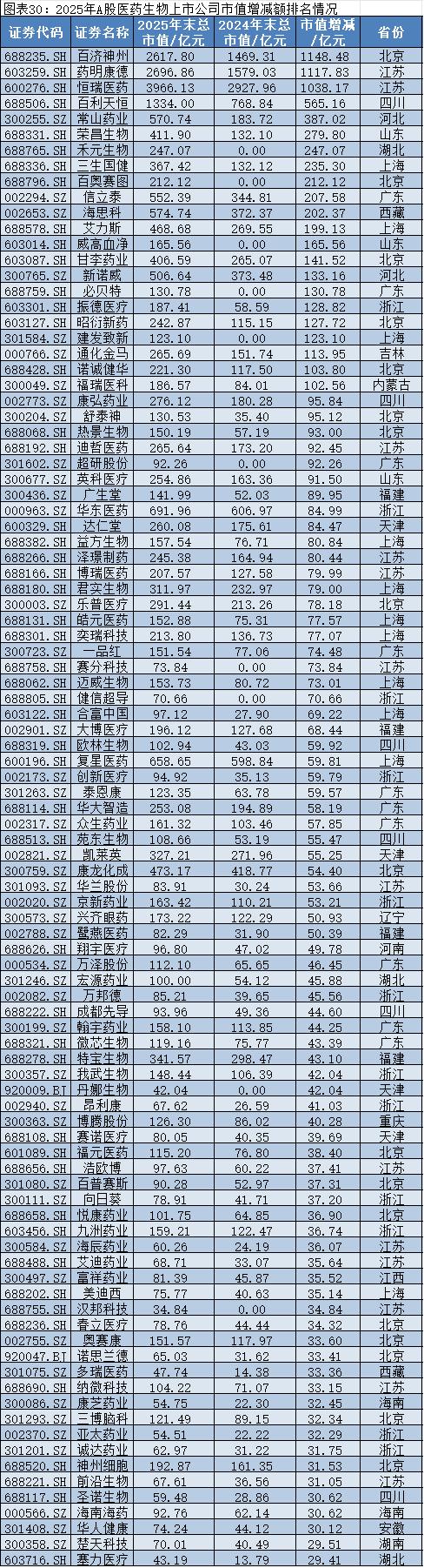 头部企业中,百济神州(688235.SH)、药明康德(603259.SH)、恒瑞医药(600276.SH)等创新药产业链龙头市值增长均超千亿元,排名前三,彰显创新驱动的核心价值。