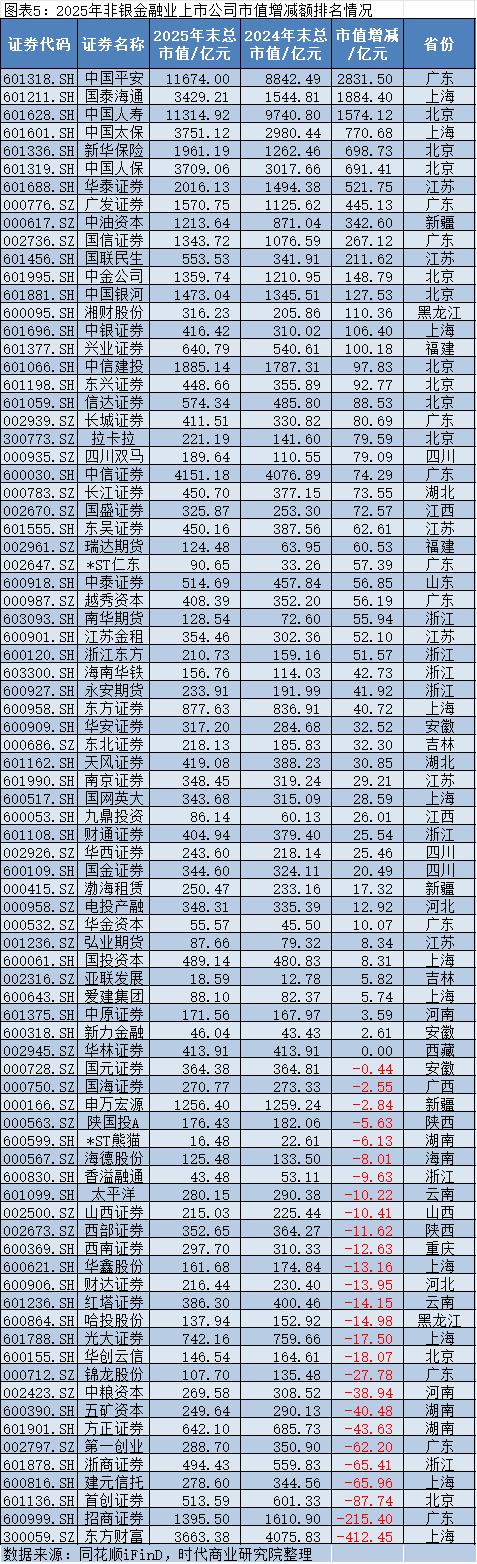 2025年,非银金融上市公司市值增加最多的是中国平安,其2025年年末的市值约为11674亿元,较2024年年末的8842.49亿元增加约2831.50亿元;市值减少最多的是东方财富(300059.SZ),其2025年年末的市值约为3663.38亿元,较2024年年末的4075.83亿元减少约412.45亿元。