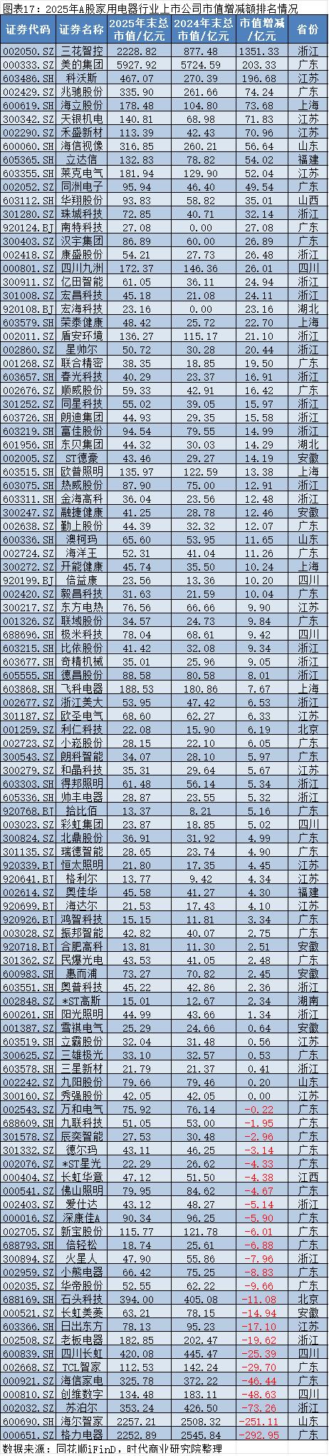 同花顺iFinD数据显示,2025年,在家用电器行业中,市值增加最多的是三花智控(002050.SZ),其2025年12月31日的市值约为2228.82亿元,较2024年12月31日的877.48亿元增加约1351.33亿元;市值减少最多的是格力电器(000651.SZ),其2025年12月31日的市值约为2252.89亿元,较2024年12月31日的2545.84亿元减少约292.95亿元。