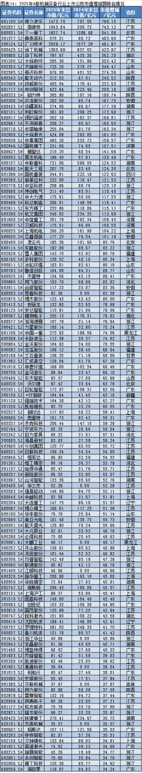 同花顺iFinD数据显示,2025年,在机械设备行业中,市值增加最多的是恒立液压(601100.SH),其2025年12月31日的市值约为1473.70亿元,较2024年12月31日的707.55亿元增加约766.15亿元;市值减少最多的是中国中车(601766.SH),其2025年12月31日的市值约为1895.25亿元,较2024年12月31日的2241.46亿元减少约346.22亿元。