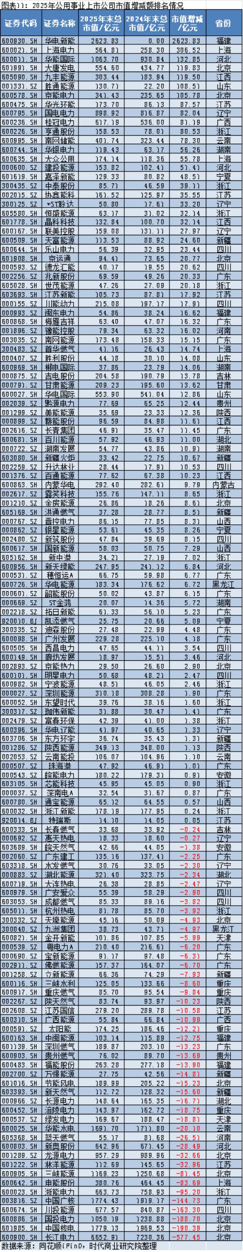 2025年,剔除新股华电新能(600930.SH)后,公用事业上市公司市值增加最多的是上海电力(600021.SH),其2025年年末的市值约为564.81亿元,较2024年年末的258.30亿元增加约306.52亿元;市值减少最多的是长江电力,其2025年年末的市值约为6652.91亿元,较2024年年末的7230.36亿元减少约577.45亿元。