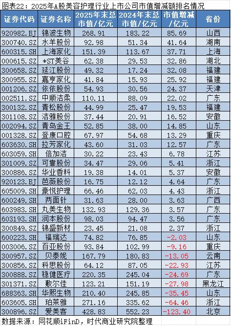 同花顺iFinD数据显示,2025年,在美容护理行业中,市值增加最多的是锦波生物(920982.BJ),其2025年12月31日的市值约为268.91亿元,较2024年12月31日的183.22亿元增加约85.69亿元;市值减少最多的是爱美客(300896.SZ),其2025年12月31日的市值约为428.83亿元,较2024年12月31日的552.23亿元减少约123.40亿元。