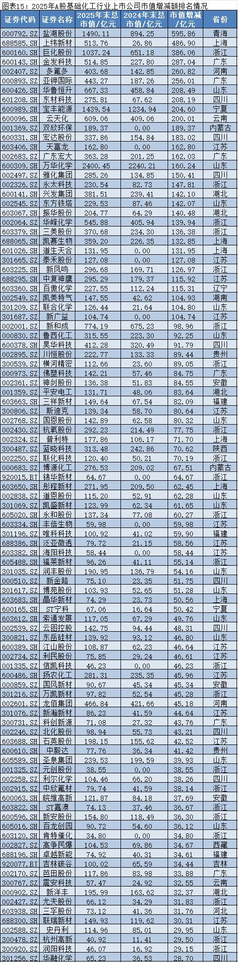 同花顺iFinD数据显示,2025年,在基础化工行业中,市值增加最多的是盐湖股份(000792.SZ),其2025年12月31日的市值约为1490.11亿元,较2024年12月31日的894.25亿元增加约595.86亿元;市值减少最多的是川发龙蟒(002312.SZ),其2025年12月31日的市值约为206.33亿元,较2024年12月31日的273.39亿元减少约67.06亿元。