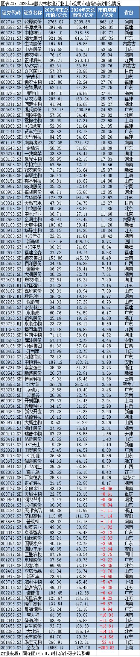 同花顺iFinD数据显示,2025年,在农林牧渔行业中,市值增加最多的是牧原股份(002714.SZ),其2025年12月31日的市值约为2763.07亿元,较2024年12月31日的2099.89亿元增加约663.18亿元;市值减少最多的是金龙鱼(300999.SZ),其2025年12月31日的市值约为1558.17亿元,较2024年12月31日的1767.98亿元减少约209.82亿元。