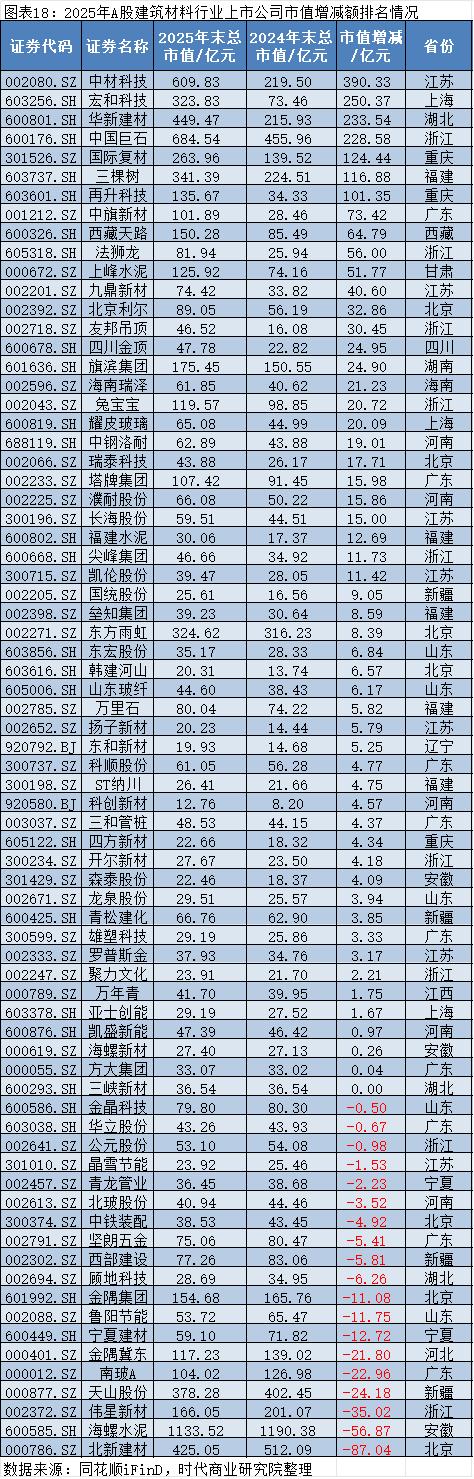 同花顺iFinD数据显示,2025年,在建筑材料行业中,市值增加最多的是中材科技(002080.SZ),其2025年12月31日的市值约为609.83亿元,较2024年12月31日的219.50亿元增加约390.33亿元;市值减少最多的是北新建材(000786.SZ),其2025年12月31日的市值约为425.05亿元,较2024年12月31日的512.09亿元减少约87.04亿元。