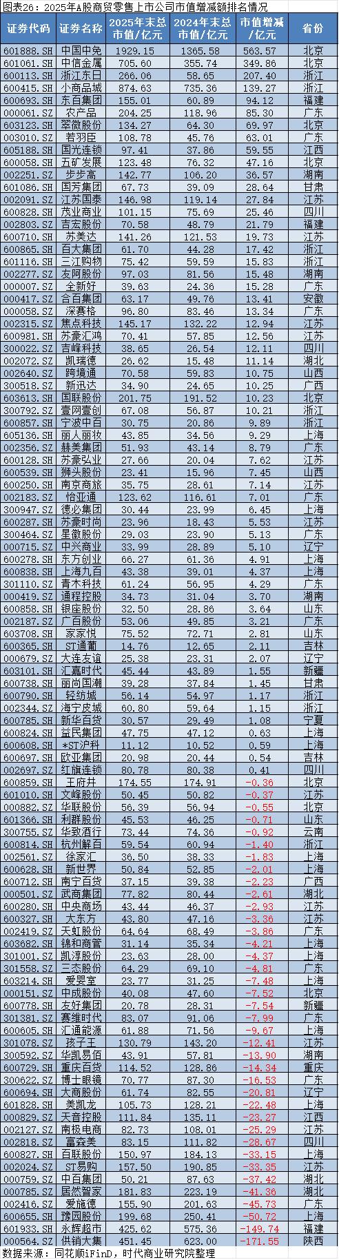 区域分布上,北京(央企及免税龙头集聚)、浙江(专业市场密集)、上海(高端百货与零售创新高地)等地的商贸零售企业表现活跃,区域资源禀赋与政策导向形成差异化竞争优势,推动区域内企业市值增长。