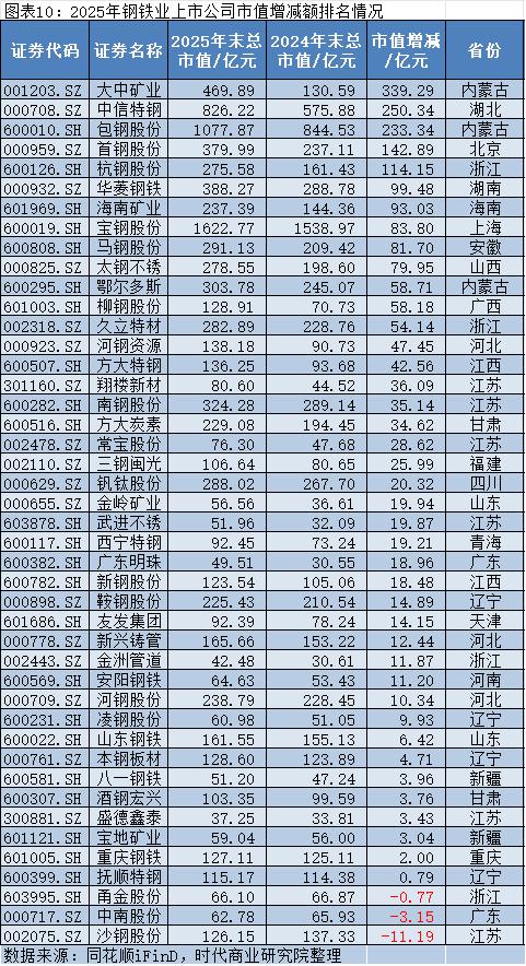 2025年,钢铁上市公司市值增加最多的是大中矿业(001203.SZ),其2025年年末的市值约为469.89亿元,较2024年年末的130.59亿元增加约339.2945亿元,增长了两倍多;市值减少最多的是沙钢股份(002075.SZ),其2025年年末的市值约为126.15亿元,较2024年年末的137.33亿元减少约11.19亿元。