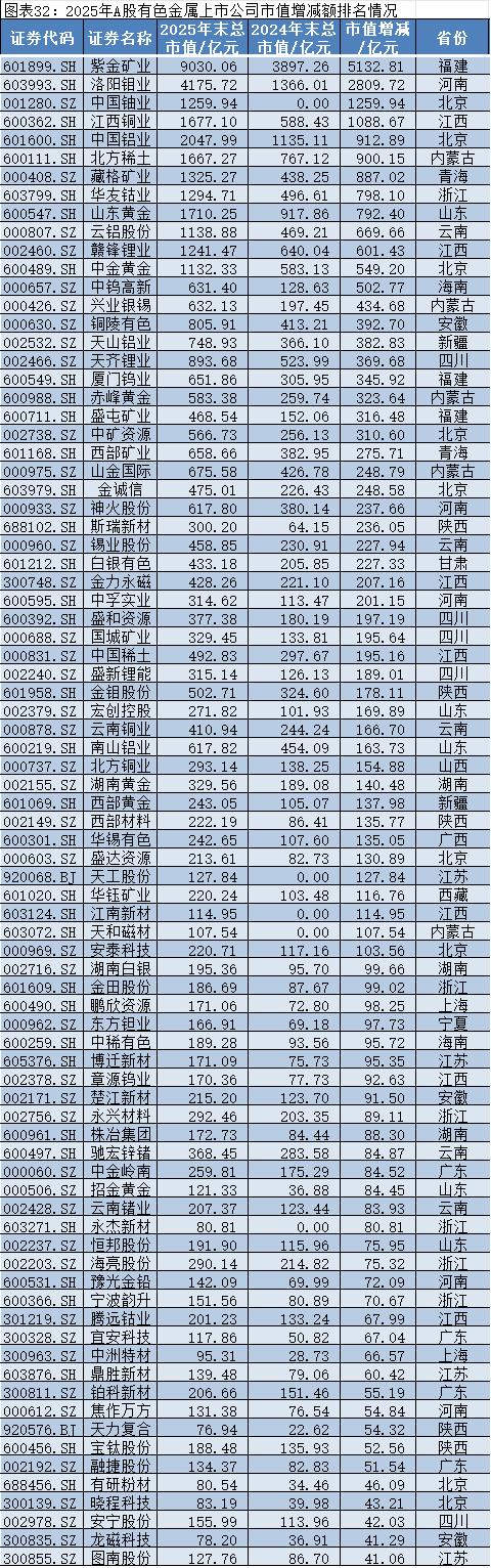 头部企业中,紫金矿业(601899.SH)市值增长超5000亿元,排名第一,成为A股资源股标杆,其全球资源布局、成本控制优势及多元化矿产储备,在战略资源价值重估中获得显著溢价,受益于黄金、铜价同步走强。