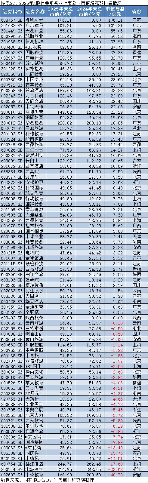 行业亮点在于经济活动正常化推动旅游、检测等细分领域需求复苏,同时专业服务领域受政策支持与产业升级驱动,增长韧性较强;挑战则是部分教育、酒店连锁企业市值仍录得负增长,教育行业受政策调控影响持续,酒店连锁企业面临同质化竞争与需求复苏不及预期压力,行业复苏节奏不均衡,区域与细分领域差异显著,整体增长动能不足。