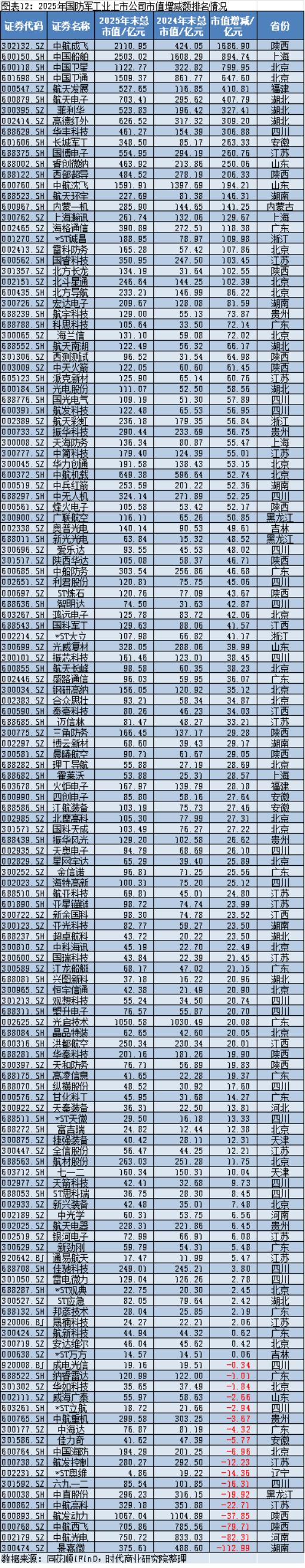 同花顺iFinD数据显示,截至2025年年末,A股市场市值最大的国防军工上市公司是中国船舶(600150.SH),约为2503.02亿元;市值最小的国防军工上市公司是*ST奥维(002231.SZ),约为4.86亿元。