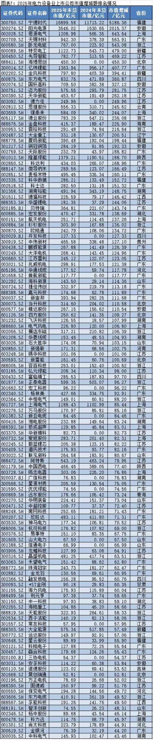 2025年,电力设备上市公司市值增加最多的是宁德时代,其2025年年末的市值约为16899.58亿元,较2024年年末的11713.22亿元增加约5186.36亿元;市值减少最多的是国电南瑞(600406.SH),其2025年年末的市值约为1805.54亿元,较2024年年末的2025.88亿元减少约220.34亿元。