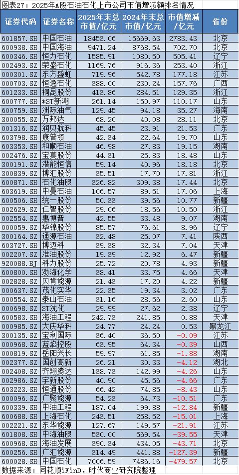 头部企业中,2025年中国石油(601857.SH)、中国海油(600938.SH)两大巨头市值分别增长2783.43亿元和702.70亿元,排名前二,其在油气勘探开采领域的核心资源储备与盈利稳定性获得市场认可,估值中枢持续上移。