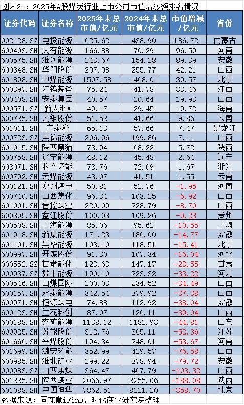 同花顺iFinD数据显示,2025年,在煤炭行业中,市值增加最多的是电投能源(002128.SZ),其2025年12月31日的市值约为625.62亿元,较2024年12月31日的438.90亿元增加约186.72亿元;市值减少最多的是中国神华(601088.SH),其2025年12月31日的市值约为7862.51亿元,较2024年12月31日的8221.20亿元减少约358.70亿元。