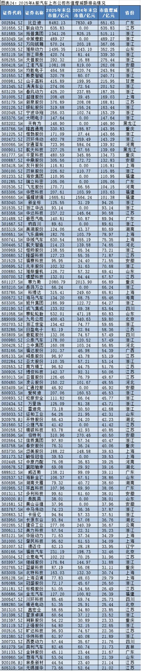 从头部企业表现来看,比亚迪(002594.SZ)作为行业龙头,2025年市值增长651.63亿元,增幅行业第一,其全产业链布局与技术领先优势在市场竞争中持续凸显,依托电池、整车及智能化技术协同,巩固了行业地位。