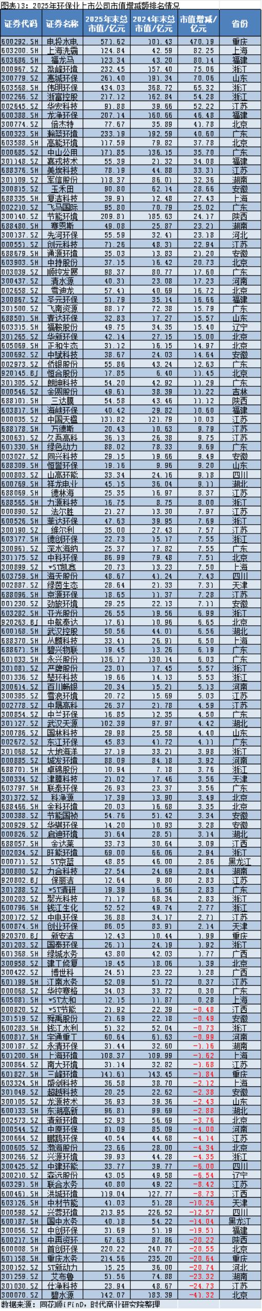 2025年,环保上市公司市值增加最多的是电投水电,其2025年年末的市值约为571.62亿元,较2024年年末的101.43亿元增加约470.19亿元,增长了4倍多;市值减少最多的是碧水源(300070.SZ),其2025年年末的市值约为142.07亿元,较2024年年末的183.39亿元减少约41.32亿元。