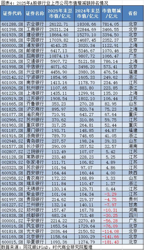 同花顺iFinD数据显示,2025年,银行板块市值增加最多的是农业银行,其2025年年末的市值约为2.61万亿元,较2024年年末的1.83万亿元增加约7814.05亿元;市值减少最多的是华夏银行(600015.SH),其2025年年末的市值约为1093.36亿元,较2024年年末的1274.79亿元减少约181.43亿元。