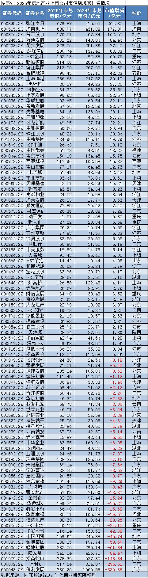 2025年,房地产上市公司市值增加最多的是张江高科(600895.SH),其2025年年末的市值约为679.87亿元,较2024年年末的415.05亿元增加约264.83亿元;市值减少最多的是保利发展(600048.SH),其2025年年末的市值约为730.20亿元,较2024年年末的1060.58亿元减少约330.38亿元。