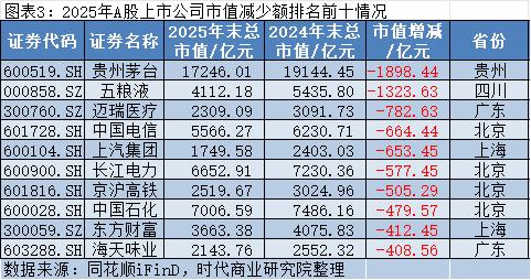同花顺iFinD数据显示,2025年,市值增加最多的是工业富联,其2025年12月31日的市值约为12322.01亿元,较2024年12月31日的4271.62亿元增加约8050.39亿元,增长近2倍,成为A股市值增长冠军;市值减少最多的是贵州茅台,其2025年12月31日的市值约为17246.01亿元,较2024年12月31日的19144.45亿元减少约1898.44亿元,成为A股市值缩水之最。