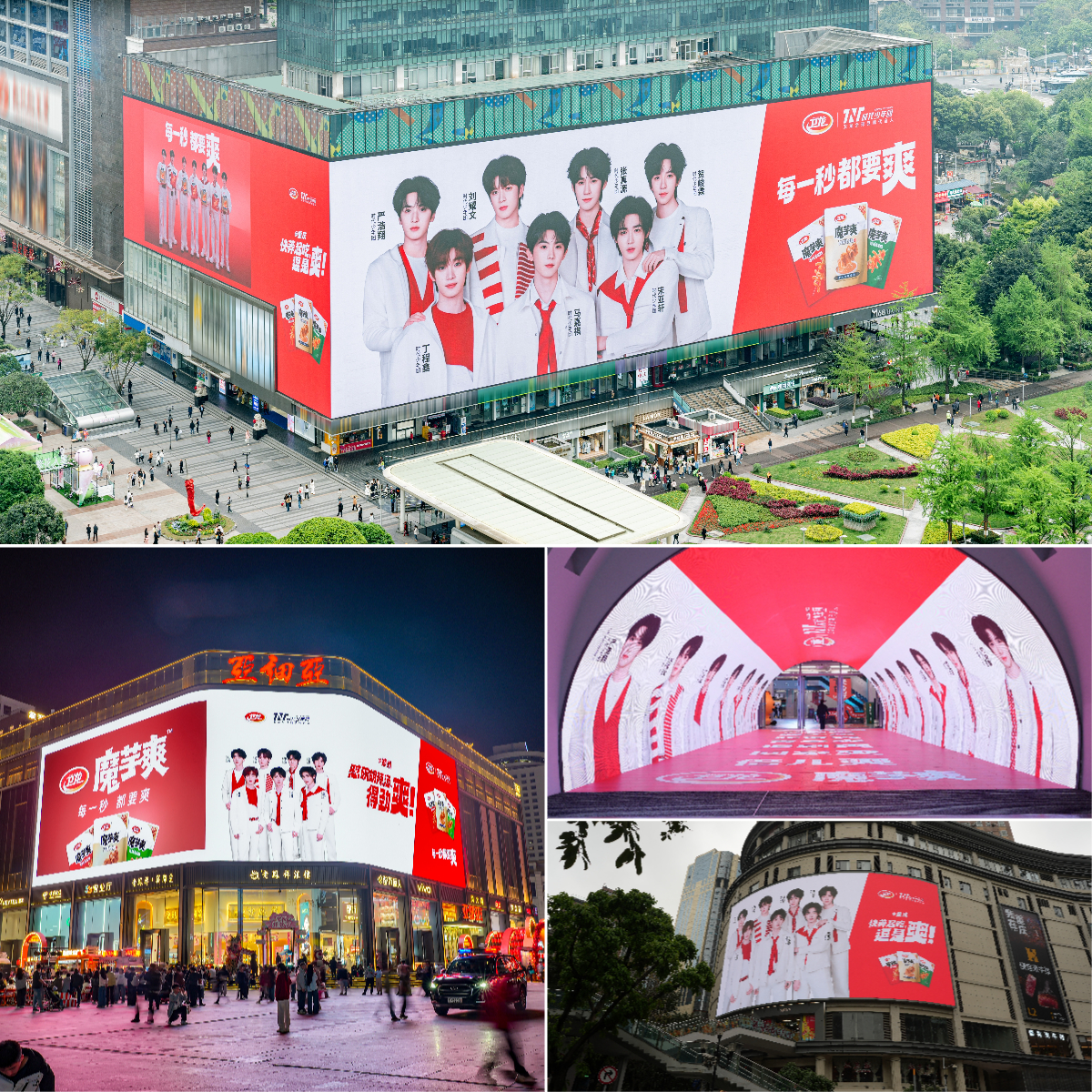 4月2日,卫龙联合时代少年团打造一支“每一秒都要爽”的TVC在各大平台火爆传播,线下卫龙携手时代少年团形象强势登陆北京、上海、广州、重庆、成都、杭州、郑州等7座城市,户外大屏结合地域特色轮番轰炸,让卫龙的辣爽主张覆盖城市每一个角落。