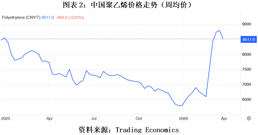 2026年2月28日美以伊冲突爆发后,霍尔木兹海峡航运受阻,国际油价快速上涨,影响迅速传导至聚烯烃市场。根据上海钢联旗下的隆众资讯,3月国内聚乙烯市场价格经历“急涨-急跌-高位震荡”的走势,3月18日价格突破9000元/吨,短期涨幅显著。