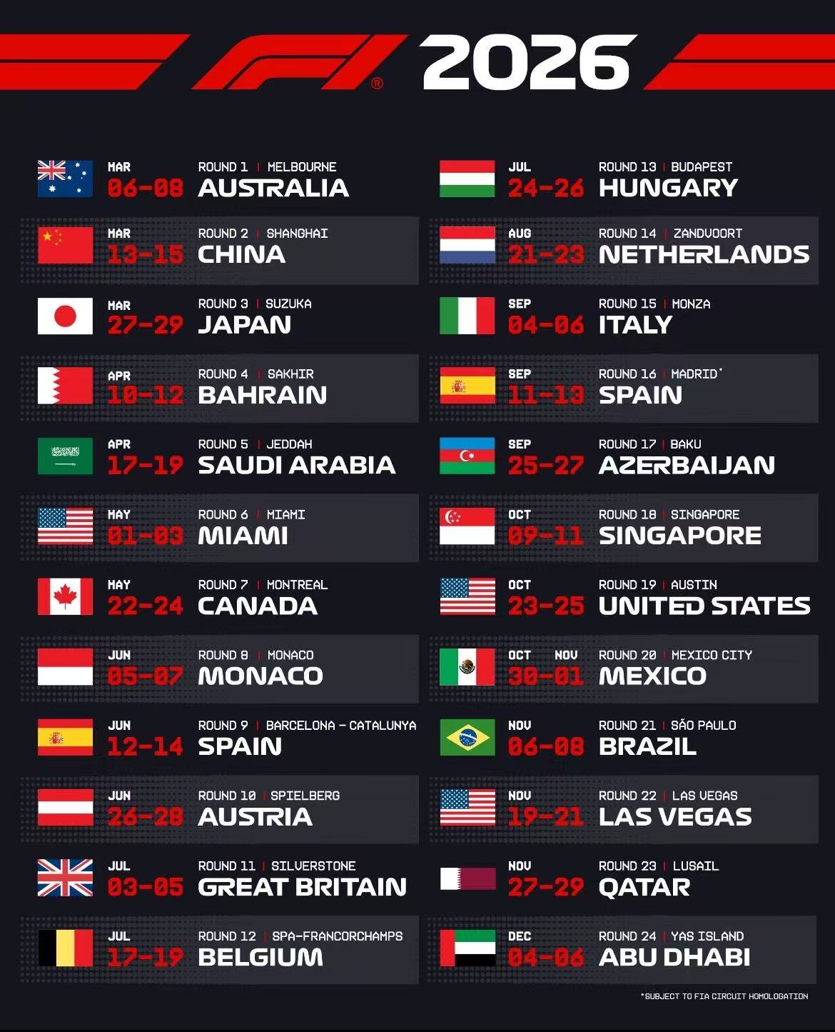2026赛季F1赛历(图源:网络)
