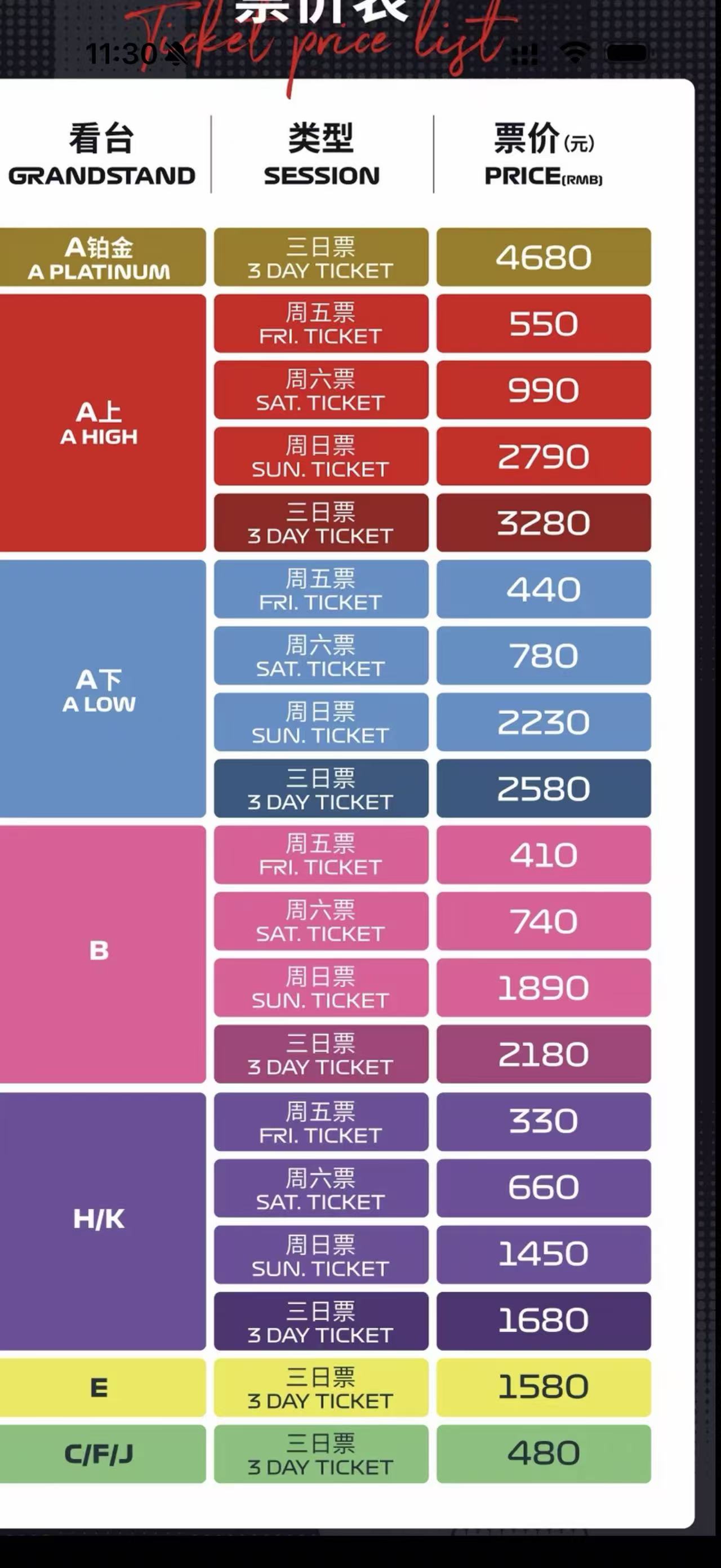2026年F1上海大奖赛门票的各个价位(图源:网络截图)