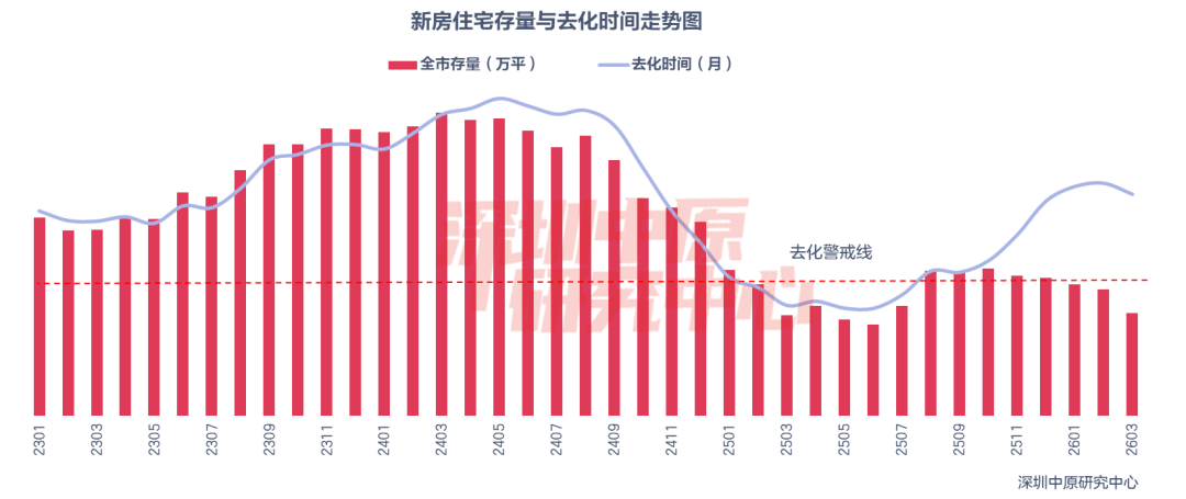 成交持续回升的同时,新房库存也有所减少。根据深圳中原研究中心统计,截至3月末,深圳全市新房住宅存量为281.4万平方米。过去一年平均成交量计算去化时间约为15.79个月,3月份去化周期较2月份减少0.79个月。