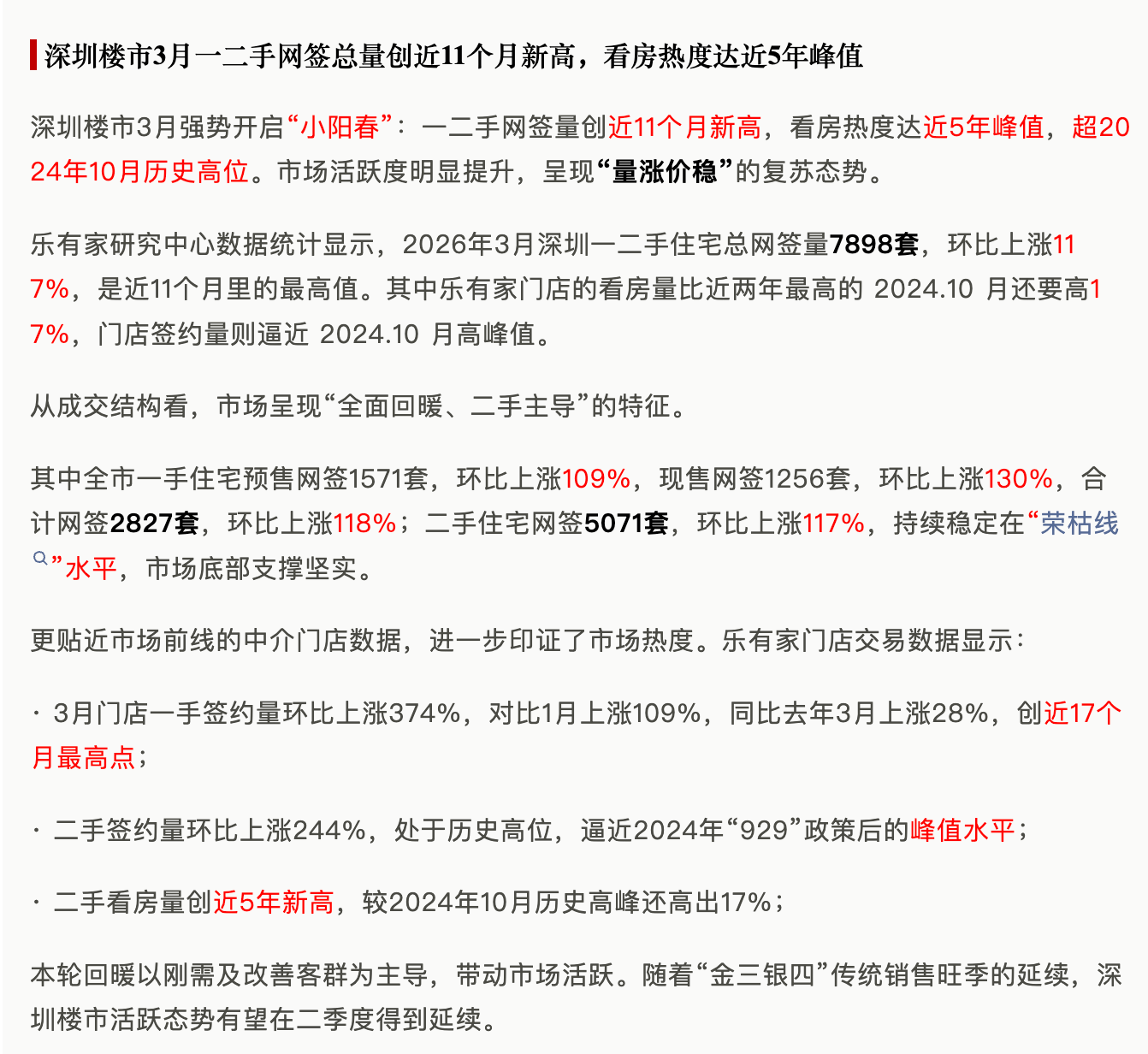 另据乐有家研究中心数据,3月深圳一二手住宅总网签量创近11个月新高的同时,门店看房热度更是达到近5年峰值,市场呈现出鲜明的“量涨价稳”复苏态势。