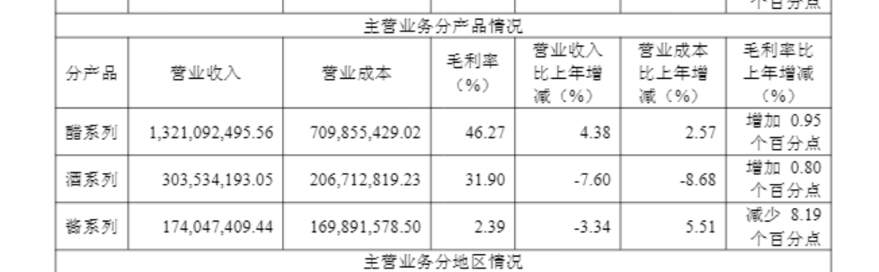 数据显示,报告期内,公司仅醋系列产品实现增长,全年营收13.21亿元,同比增长4.38%,对应销量22.8万吨;而酒系列产品与酱系列产品则双双下滑,分别实现营收3.04亿元、1.74亿元,同比下降7.60%、3.34%,销量分别为8.4万吨、3.3万吨。
