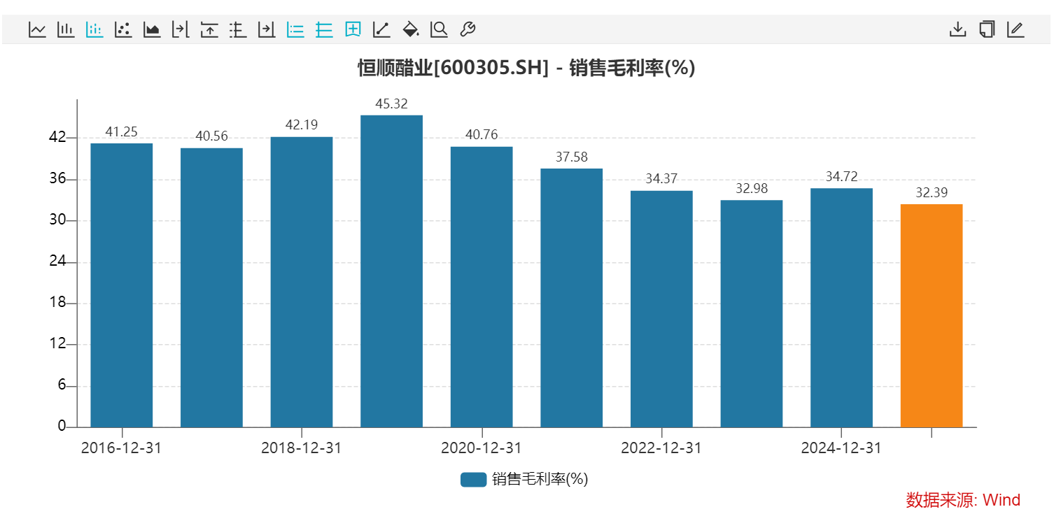 受营收下滑、成本上行的双重挤压,酱系列产品2025年毛利率同比大幅下降8.19个百分点,仅为2.39%。受其拖累,恒顺醋业全年综合毛利率同比下降2.93个百分点至32.17%,创下近十年新低。
