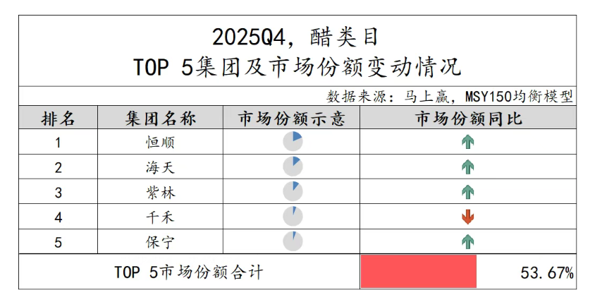 作为国内调味品行业的绝对龙头,海天味业于2017年收购镇江丹和醋业,正式进军食醋行业。据马上赢发布的《2025Q4调味品市场回顾》市场报告,醋类目TOP5市场份额合计53.67%,其中海天味业位居第二,仅次于恒顺。