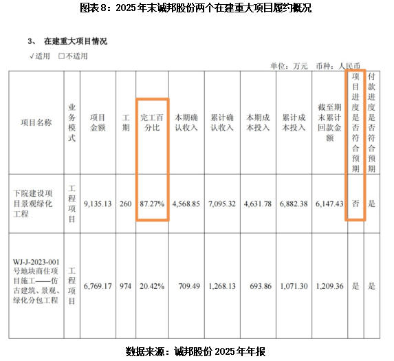 2025年年报显示,截至当年末,该项目的完工比例已升至87.27%,当期确认收入4568.85万元,累计确认收入7095.32万元,累计成本投入6882.38万元。诚邦股份在年报中提及,该项目付款进度符合预期,但整体施工进度仍未达计划目标。