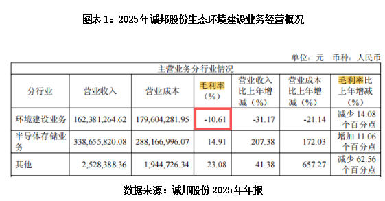 2025年年报显示,诚邦股份5家子公司中,除了跨界布局半导体的芯存科技实现盈利,其余4家子公司均聚焦建筑、生态建设,其中3家出现实质性亏损,剩余1家净利润仅为4.76元(财务报表单位疑似编制错误,或应为“万元”,截至目前该公司尚未发布相关更正公告),勉强徘徊在盈亏平衡线边缘。子公司层面的集体失血,成为诚邦股份生态环境建设业务整体业绩恶化的核心推手。