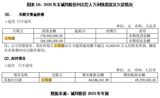 除了通过质押资产融资,诚邦股份亦向实际控制人大规模拆借资金。年报显示,2025年,诚邦股份向实际控制人方利强累计拆入资金约1.79亿元,累计偿还资金约1.85亿元;截至2025年末,诚邦股份对方利强的欠款余额仍达4468.66万元。