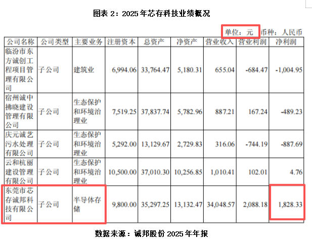 然而,这场看似华丽的主业切换,并未带动公司整体盈利能力的改善。据2025年年报,作为公司半导体存储业务的核心载体,芯存科技2025年仅实现净利润1828.33元(财务报表疑似编制错误,单位或应为“万元”,截至目前该公司尚未披露更正公告),净利率仅为5.37%。按诚邦股份51.02%的持股比例计算,芯存科技为诚邦股份贡献的净利润仅为932.81元(单位或应为“万元”)。