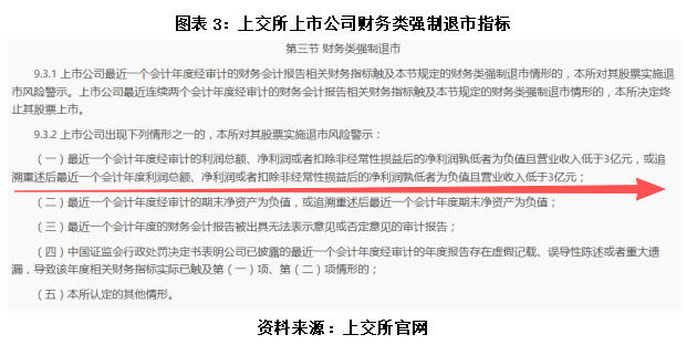 根据《上海证券交易所股票上市规则》,主板上市公司财务类强制退市的核心指标之一为:最近一个会计年度经审计的利润总额、净利润或者扣非净利润孰低者为负值且营业收入低于3亿元,或追溯重述后最近一个会计年度利润总额、净利润或者扣非净利润孰低者为负值且营业收入低于3亿元。