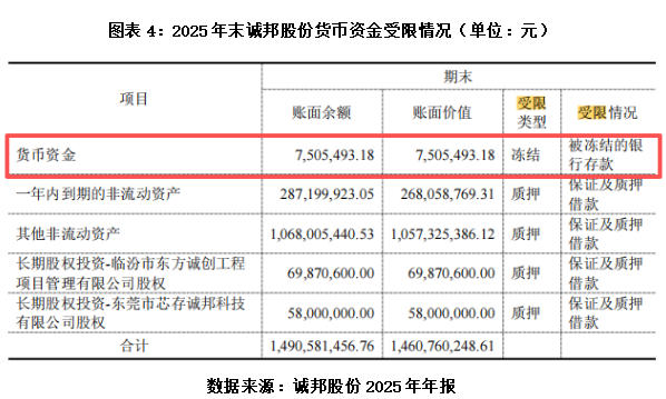 在债务层面,诚邦股份面临较大的资金链压力,资产负债率连续四年维持在70%以上,且呈逐年上升态势。年报显示,截至2025年末,该公司合计有14.91亿元资产处于受限状态,货币资金余额仅为0.86亿元,其中750.55万元银行存款处于冻结状态;同期末,该公司短期借款余额为1.69亿元,长期借款余额为7.99亿元,一年内到期的非流动负债余额为9505.52万元,有息负债规模合计约为10.63亿元,约为该公司2025年营业总收入的2.1倍。