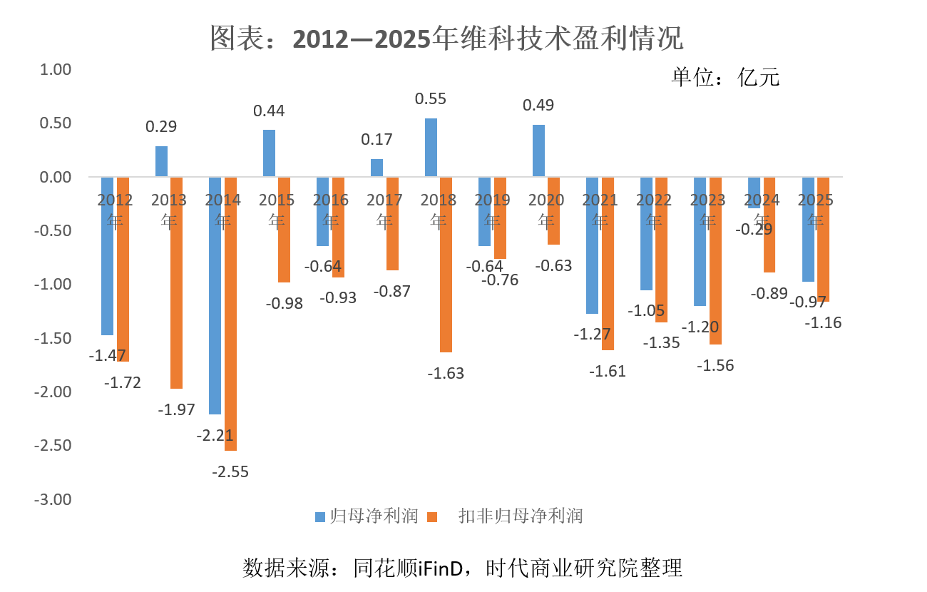 盈利能力方面,维科技术2025年归母净利润亏损9670.16万元,已连续五年亏损,扣非归母净利润更是自2012年起连续14年为负。