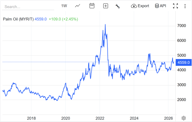 整体来看,赞宇科技的业绩呈明显的周期性,且波动与公司原材料棕榈油的价格波动呈正相关关系。2025年受中东地缘冲突、印度尼西亚生物柴油政策等因素影响,棕榈油、棕榈仁油、脂肪醇等原料价格显著增长,尤其脂肪醇受部分装置检修、负荷调整影响,阶段性供应收紧,价格涨幅较大。