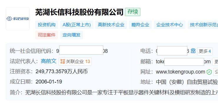 天眼查显示,长信科技成立于2006年1月,位于安徽省芜湖市,2010年5月在深交所创业板上市,主要从事车载传感器、车载盖板、中控屏模组等汽车电子业务,以及超薄液晶显示面板、超薄玻璃盖板等消费电子业务。