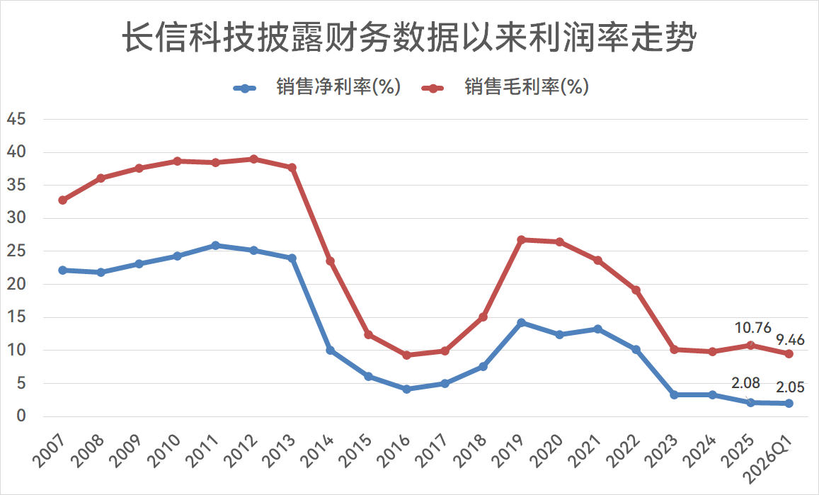 不过,龙头地位并未使其主营业务保持高利润率。Wind数据显示,长信科技上市之初2010年的毛利率可达38.62%,自2012年开始下滑,近3年均维持在10%左右的水平,2025年及2026年一季度分别为10.76%、9.46%。净利率更低,2025年及2026年一季度分别为2.08%、2.05%。