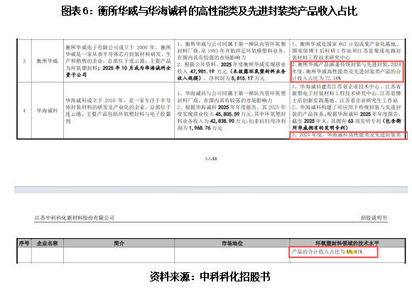 招股书还显示,2024年,衡所华威高性能类及先进封装类产品的合计收入占比为72.18%;同年,华海诚科高性能类及先进封装类产品的合计收入占比为48.41%。