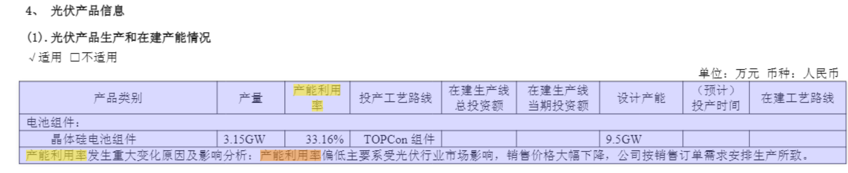 时间回溯至 2022 年,亿晶光电落地滁州重大投资计划,规划建设年产 10GW 光伏电池、10GW 光伏切片、10GW 光伏组件一体化项目,项目分期建设、分批投产。该项目于 2022 年 11 月开工,2023 年 7 月逐步投产。但伴随光伏行业集中扩产,结构性产能过剩矛盾凸显,项目投产后续建节奏大幅放缓。