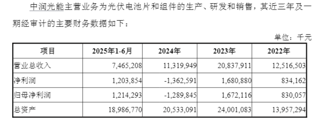 工商信息显示,宁波瑞廉设立于2025年8月,尚未开展经营业务;中润光能主营业务则为光伏电池片和组件的生产、研发和销售。财务层面,2022年至2025年上半年,中润光能营收分别为125.17亿元、208.38亿元、113.20亿元和74.65亿元,归母净利润分别为8.30亿元、16.72亿元、-12.90亿元和12.14亿元。